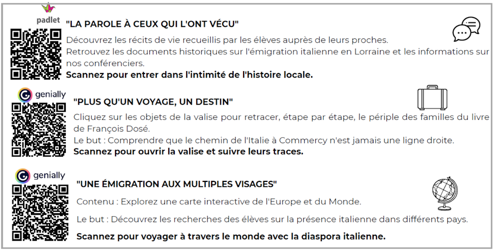 Ce projet pédagogique interdisciplinaire s’inscrit dans une démarche de transmission de la mémoire des migrations italiennes en Lorraine. Il associe histoire, littérature, mémoire, langues et culture, en mettant les élèves au cœur d’un travail de recherche, de lecture, de rencontres et de productions écrites et numériques.